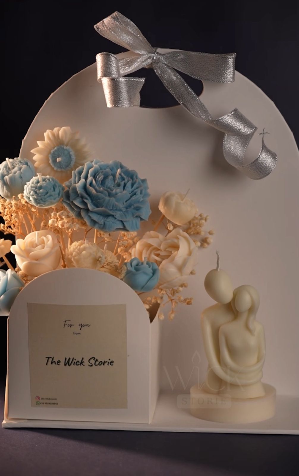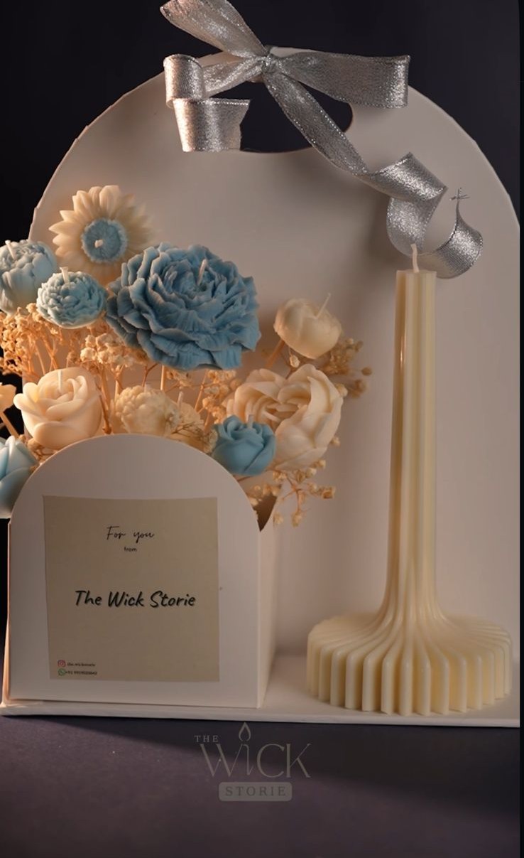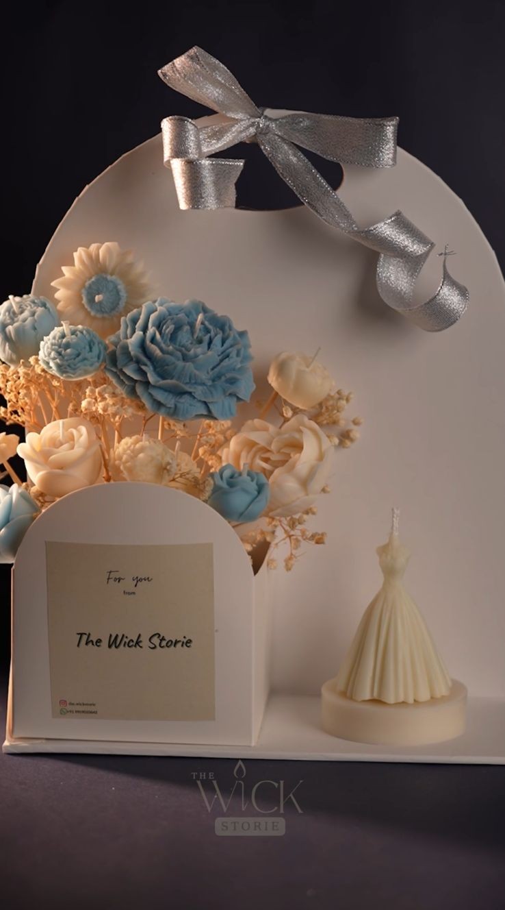 A beautifully crafted gift set featuring pastel floral candles and a romantic couple-sculpture candle. Paired with delicate dried blooms and presented in an elegant gift box with a silver ribbon, it’s a perfect piece for décor or heartfelt gifting.