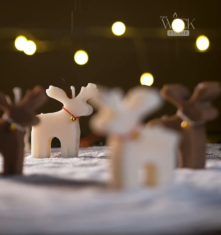 The Winter Reindeer Candle Set features charming reindeer-shaped candles in soft white and warm brown tones, decorated with tiny golden bells. Placed on a snowy surface with glowing lights in the background, this festive set brings cozy, magical holiday vibes to any décor or celebration.